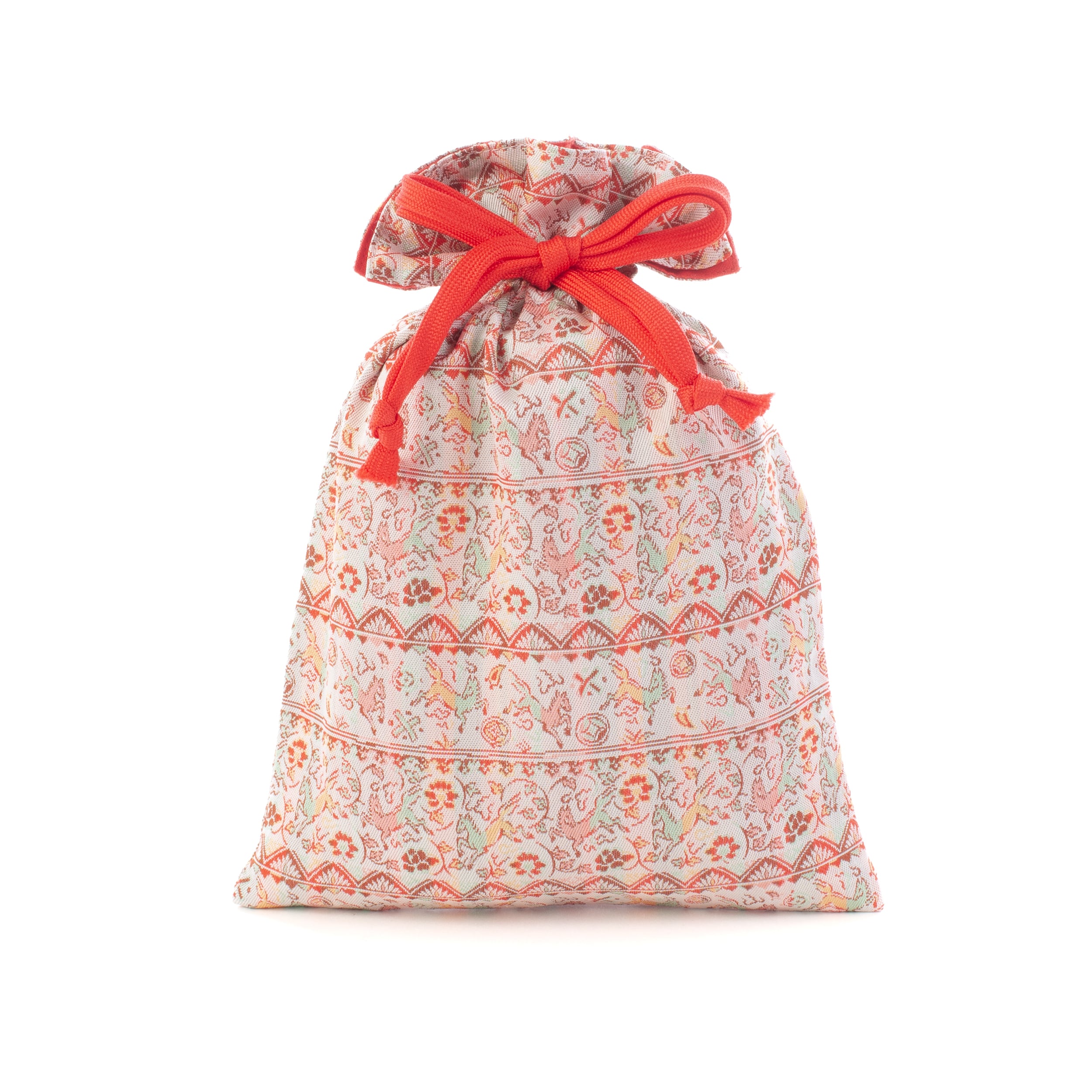 龍村美術織物の新春の干支柄の経錦「陶彩遊馬文(とうさいゆうばもん)」を使用した特製巾着袋の中に新春限定モチーフの干菓子入麩焼煎餅の小さな箱が入っています。