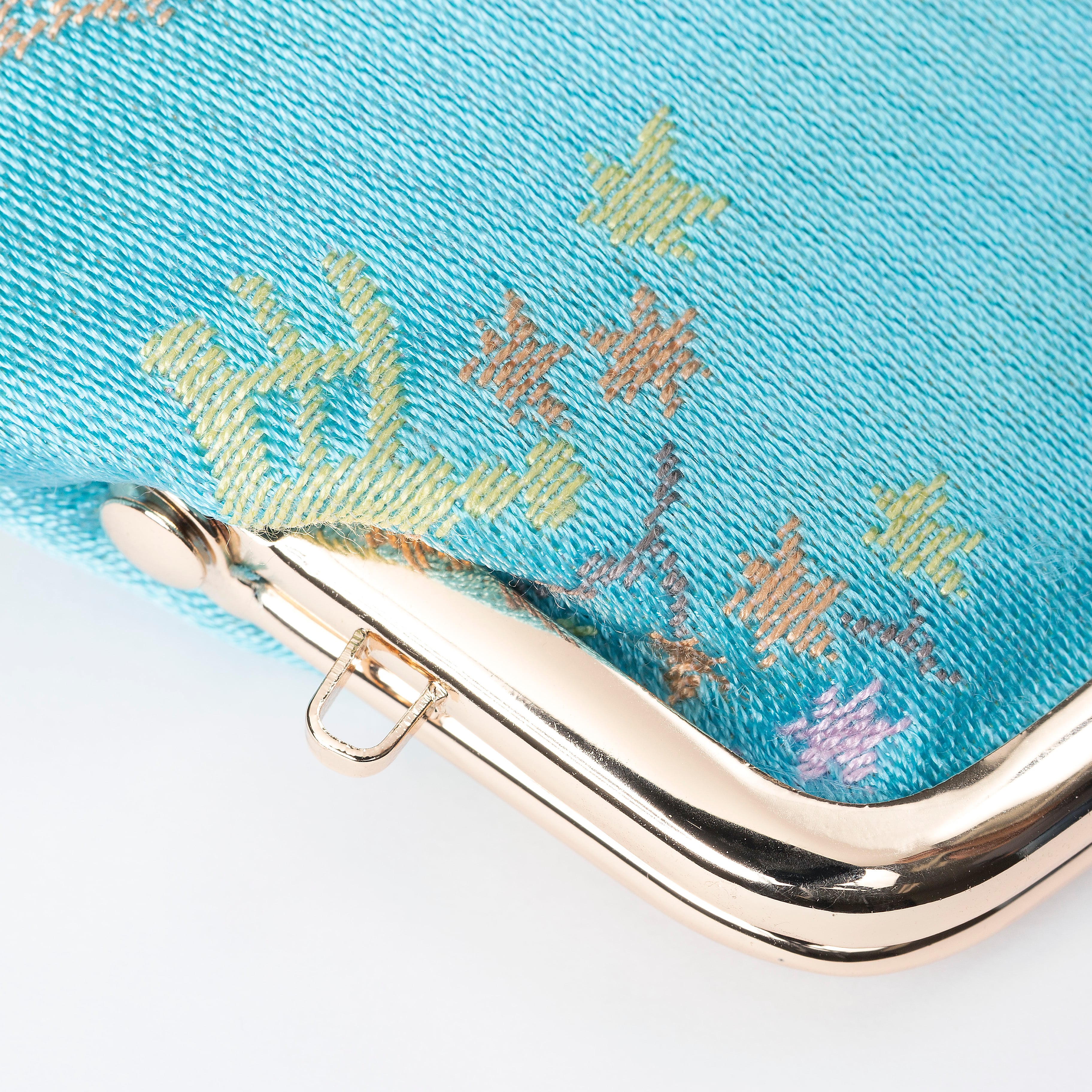 ブルーの色にはシルクのような光沢と滑らかな手触りの糸を、檜扇、桜、橘などの細かい柄には