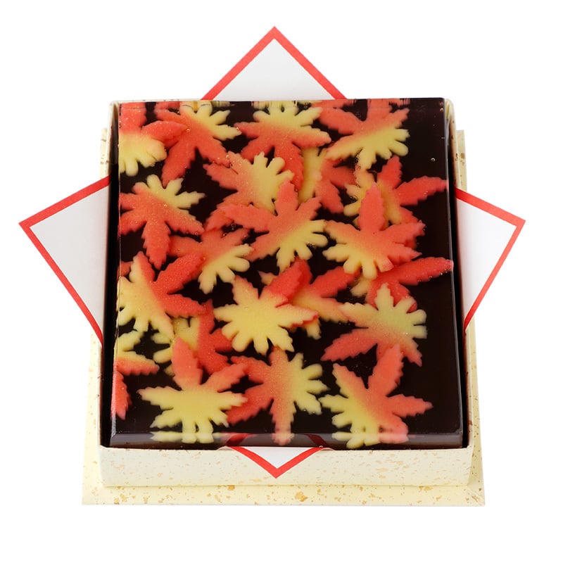 柔らかく練り上げた黒糖味の羊羹にもみじを一枚一枚手で散りばめました。