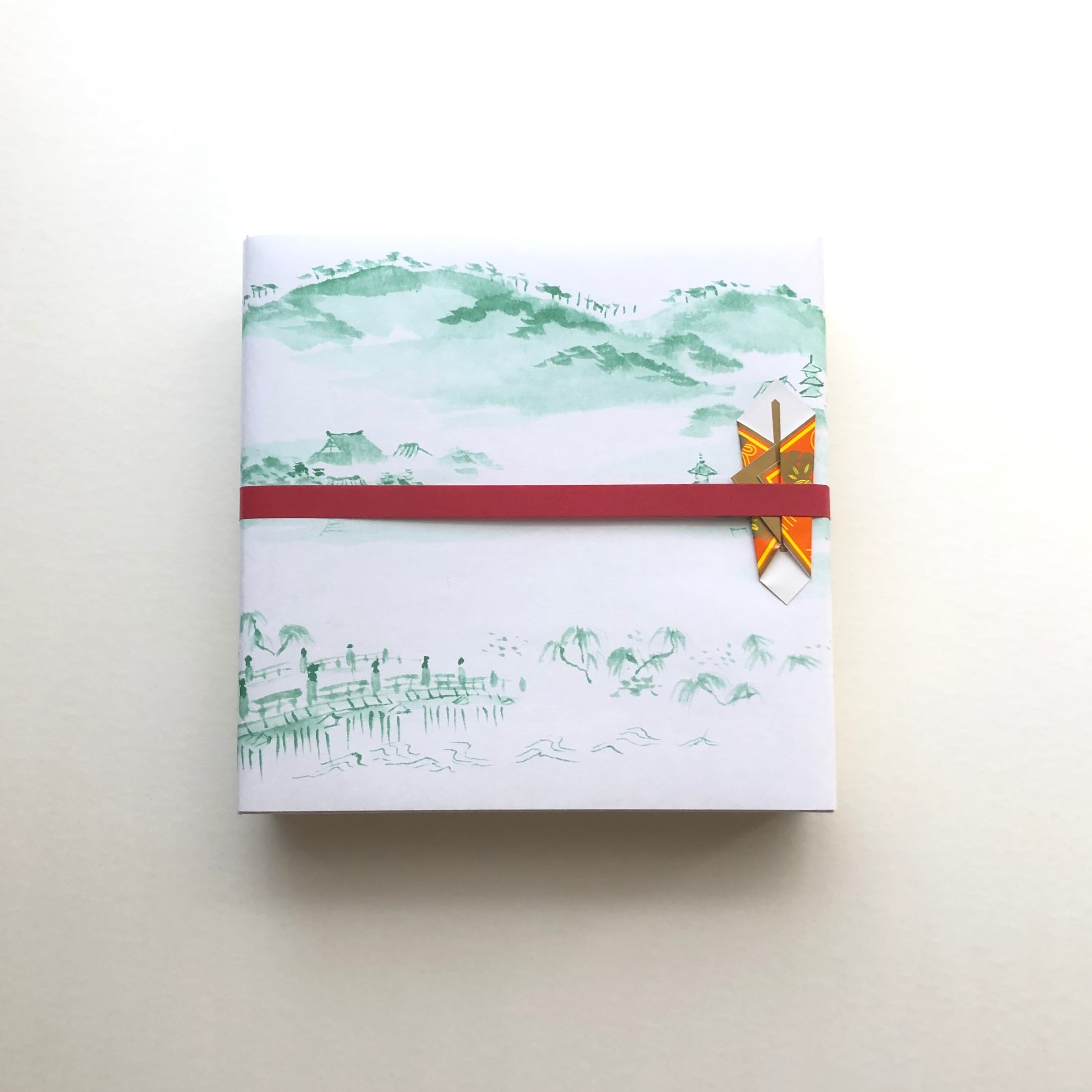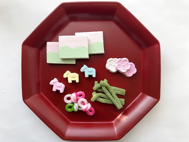 うすべに9枚、味噌合わせ9枚、打物:ねじ梅紅白各2個・福午6個、州浜(松葉)6本、