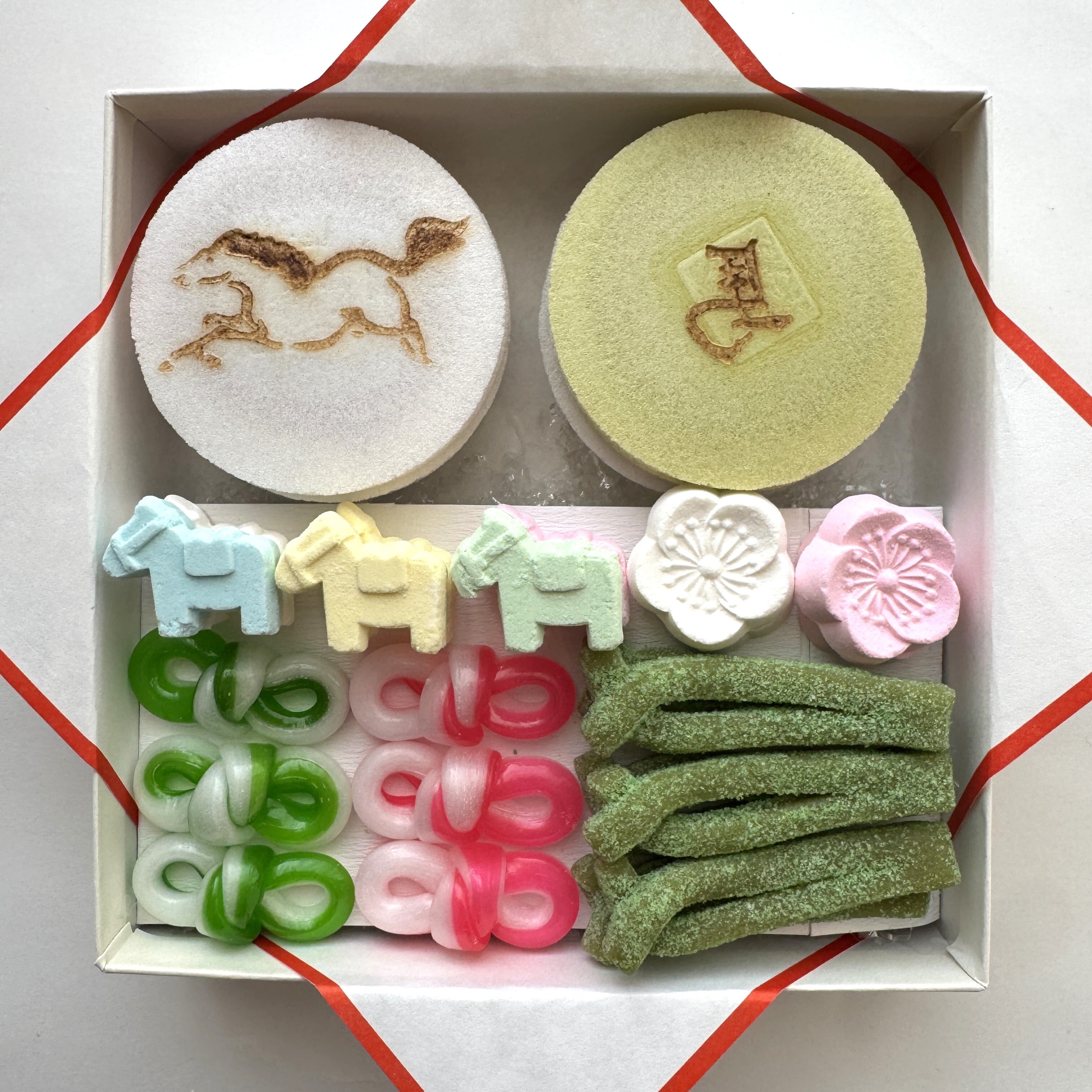 味噌合わせ6枚、打物:ねじ梅紅白各2個・福午6個、州浜(松葉)6本、