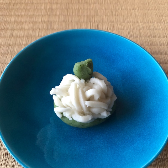 こなし製の台に少し粒あんをのせその上に、紅白のキントンをかけたものです。よもぎの香りとともにお楽しみください。