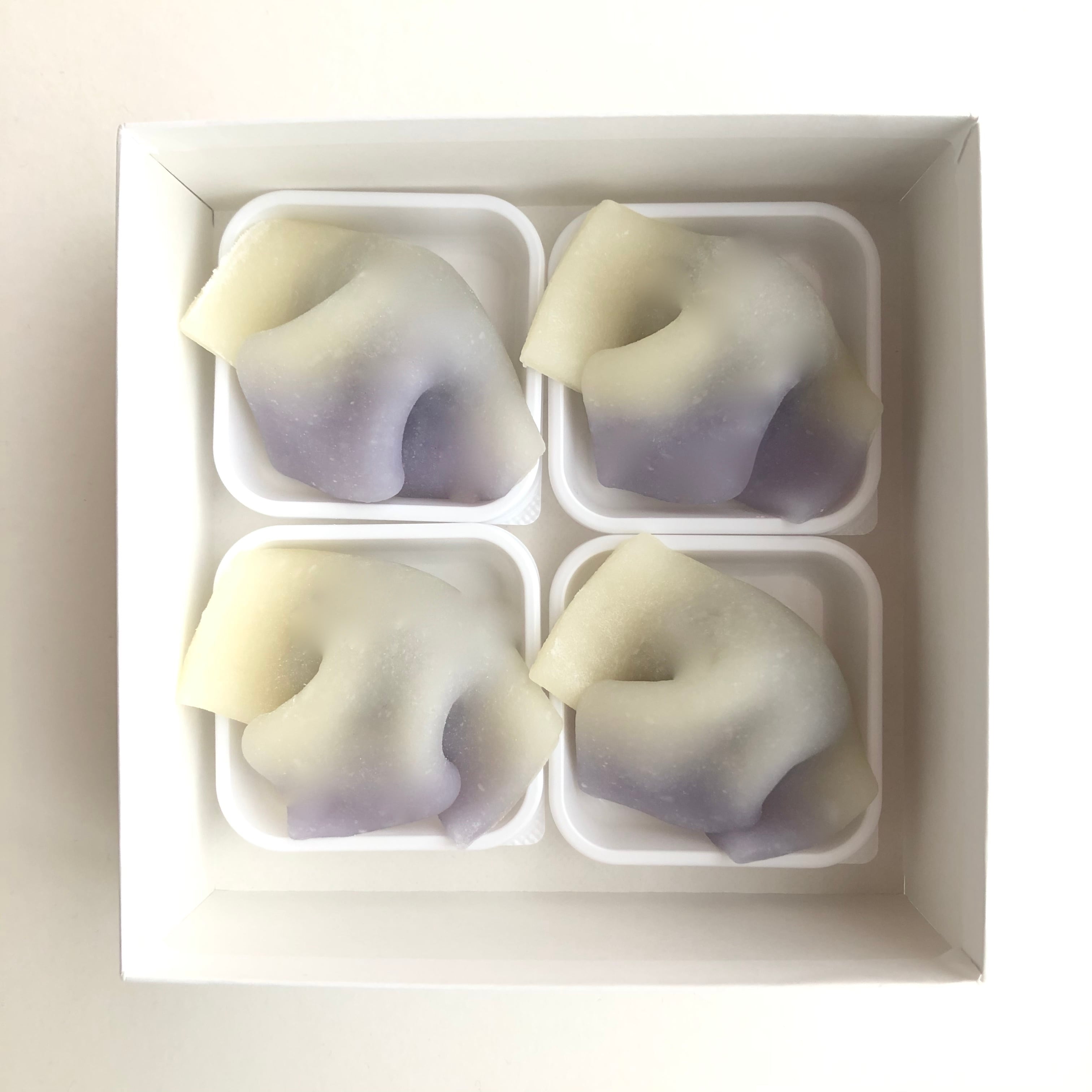 薄紫と白の2色の求肥をぼかしに染め芯は粒あんでご用意しました。